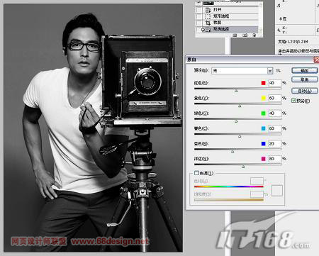 大家可以看到,此時(shí)的圖片已經(jīng)轉(zhuǎn)為黑白了,但是仔細(xì)觀察就會(huì)發(fā)現(xiàn)照片的整體顏色偏黑,細(xì)節(jié)不立體,效果并不是十分理想,這是為什么呢?不要著急,讓我們返回去仔細(xì)觀察一下原始圖片,通過觀察我們發(fā)現(xiàn):整個(gè)照片是由黃色的人物身體,紅色的人物細(xì)節(jié),青色的整體背景組成的,還不要忘記相機(jī)架上方的藍(lán)色。所以我們通過主要調(diào)整紅、黃、青、藍(lán)這4個(gè)通道來達(dá)到我們想要的效果。