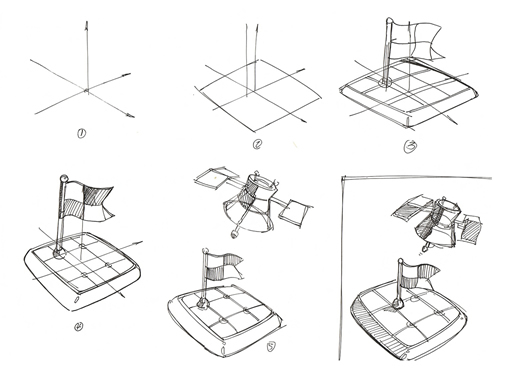 這個階段就是把我們的創意繪制出來,檢驗下視覺關系,也就是在視覺方面多在草圖上推敲,這樣效率高些,避免在渲染完后來后悔。(后悔啥!那就是重來了?。┦紫纫_定我們圖標透視,這是關系到一套方案中的每個圖標的透視方向,這是在圖標設計一致性方面的基本要求,透視統一。然后一步步的添加細節。如下圖所示: