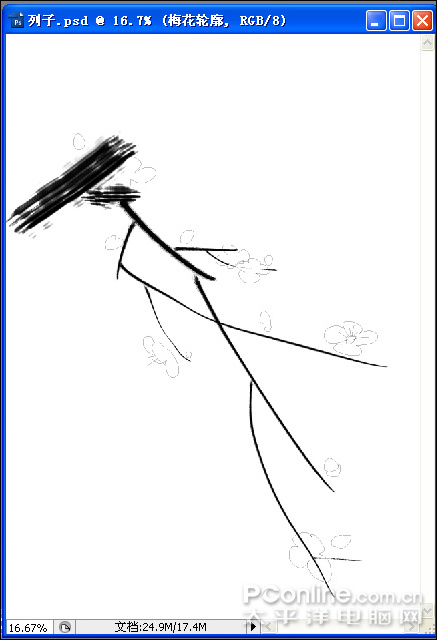 9、對照草圖利用自由鋼筆工具(快捷鍵)完成細枝的描繪,然后執行菜單:“圖層”/“新建”/“圖層”(快捷鍵shift+ctrl+n),新建圖層并命名為:梅花輪廓,如圖9所示。