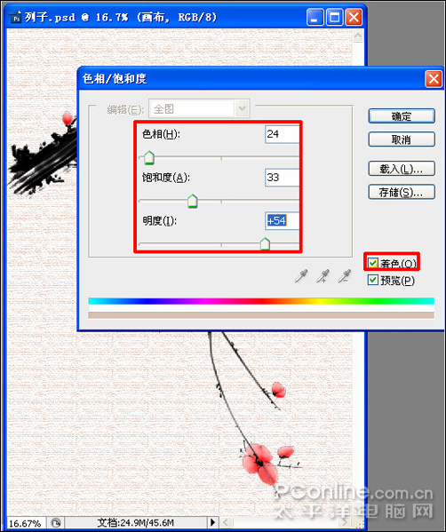 20、選中加了粗麻布濾鏡的畫布圖層,按組合鍵ctrl+u打開“色相/飽和度”對話框,首先勾選上著色選項,然后色相設置為24,飽和度為33,明度為54,然后確定,如圖20: