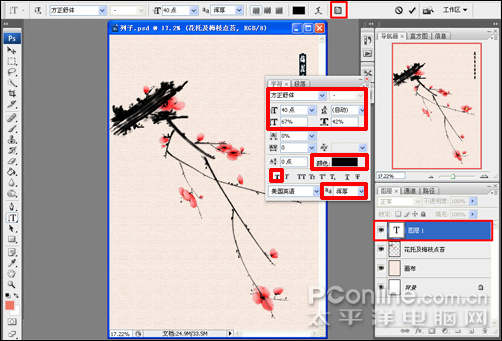 22、在工具箱中選擇直排文字工具(快捷鍵t)的狀態下,在右上角處點擊畫面輸入文字“梅花香自苦寒來”,在圖層窗口會自動生成一個新建文字圖層,之后鼠標點菜單工具欄上的“顯示/隱藏字符和段落調板”圖標,彈出字符/段落編輯窗口,設置字體系列為方正舒體,字體大小為40,行距為自動,垂直縮放67%,水平縮放42%,顏色為黑色,選擇加粗,消除鋸齒設置為渾厚,如圖22: