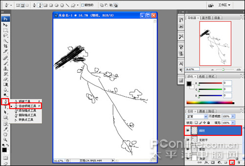 6、為了區分樹枝的層次關系,執行菜單:“圖層”/“新建”/“圖層”(快捷鍵shift+ctrl+n),新建圖層并命名為:細枝;然后選擇工具箱中的自由鋼筆工具(快捷鍵p),如圖6: