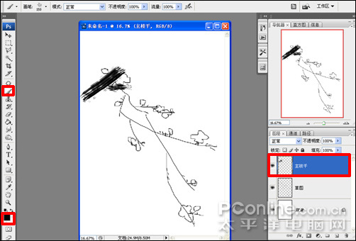 5、結合左右中括號鍵調整畫筆大小,前景色設置為黑色,在主枝干圖層上拖動鼠標畫出最粗的主干部分,如圖5所示。