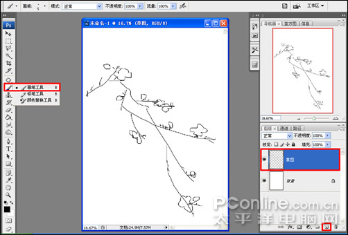 2、執行菜單:“圖層”/“新建”/“圖層”(快捷鍵shift+ctrl+n),新建圖層并命名為:草圖;選擇畫筆工具,結合左右中括號鍵調整畫筆大小,用畫筆工具勾勒出草圖,如圖2: