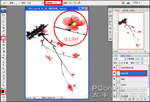 16、到了這一步,基本完成了整幅畫的繪制;為了實現更真實的國畫效果,下面我們來調整一下梅花花瓣輪廓;首先,選中梅花輪廓圖層,選擇工具箱中的畫筆工具(快捷鍵b),前景色設置為黑色,右鍵在畫布上點擊彈出畫筆選取器,選擇柔角畫筆,在菜單工具欄上不透明度設置為:50%,結合左右中括號鍵調整畫筆大小,對花瓣輪廓進行調整描繪,讓花瓣看起來更形象,如圖16: