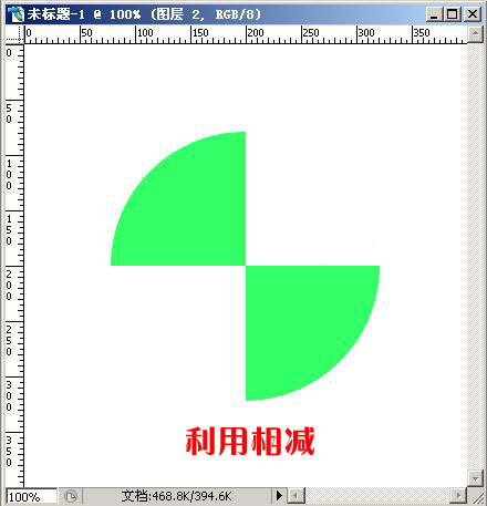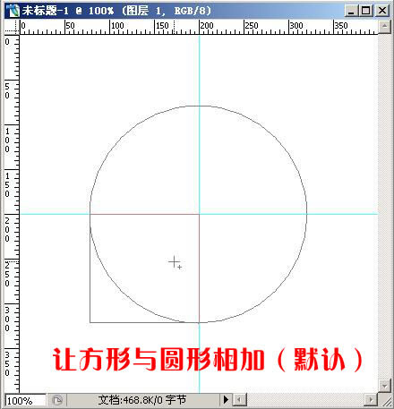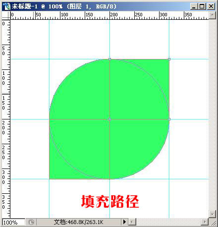 2.垂直、水平方向各拉兩條參考線,吸附到圓周上。這樣參考線就形成了一個田字形。在“田”字的左下和右上,拉兩個矩形,有參考線幫助矩形很輕松的會做出來。形狀工具間默認都是相加形式的,這樣我們就得到了一個基本的形狀。然后點選路徑選擇工具著色。