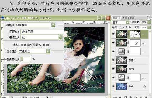 5、新建一個圖層,蓋印圖層,執行:圖像 > 應用圖像操作,添加圖層蒙版,用黑色畫筆在過亮或過暗的地方涂抹,到這一部操作完成。
