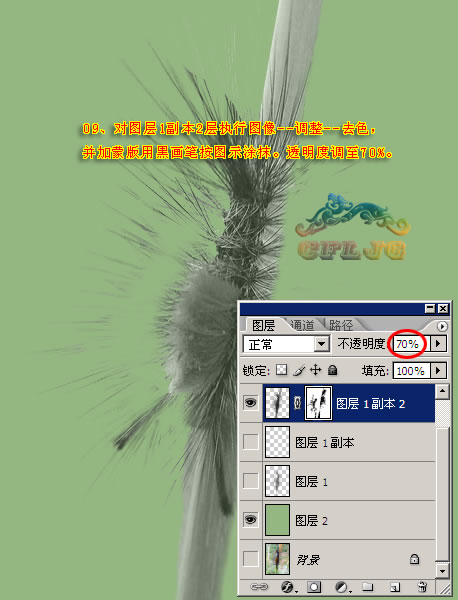 為了使圖效果更好,圖層1副本層的不透明度也應(yīng)調(diào)至70%,最后蓋印圖層,適當(dāng)?shù)匿J化以使達(dá)到更佳的效果。