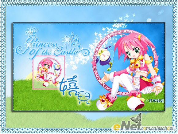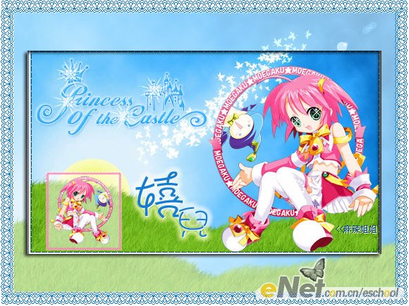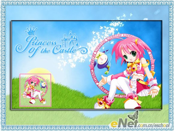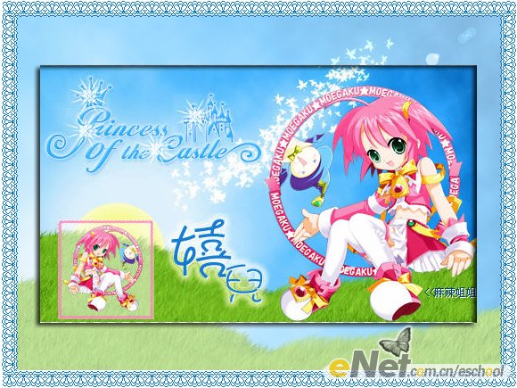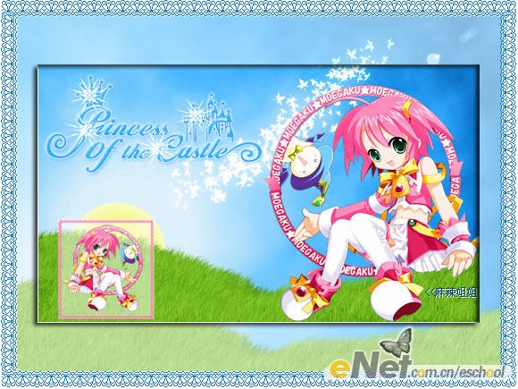 第三步:復(fù)制卡通美眉圖層,【編輯-變換-水平變換+縮小】移動(dòng)位置到左下角, 給美眉加一個(gè)簡(jiǎn)單的邊框,邊框顏色取自美眉頭發(fā)(顏色代碼ff3e8e),加一個(gè)白色的背景,不透明度50%,效果見[圖片3];