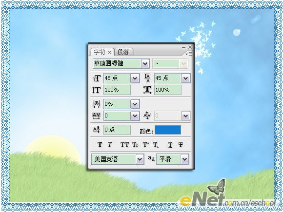 第七步:設(shè)置前景色為淺藍(lán)(顏色代碼為0f7fd1),輸入文字嬉,字體及設(shè)置效果見[圖片7],使用同種顏色輸入繁體文字兒,字體及設(shè)置效果見[圖片8]