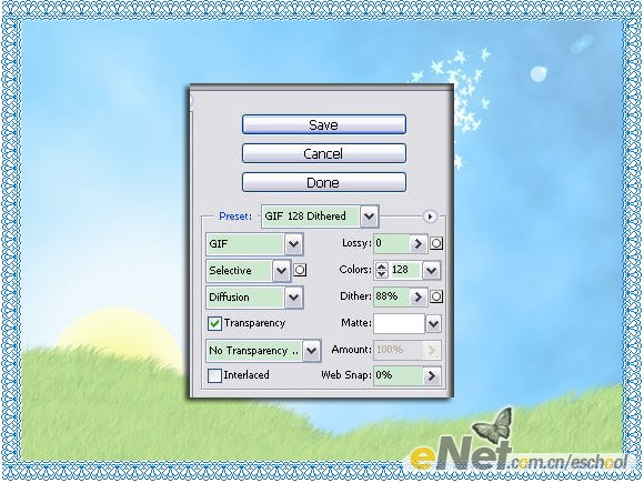 第十五步:所有幀均設(shè)置成0.2秒,點(diǎn)擊【動(dòng)畫面板-播放動(dòng)畫】按鈕,執(zhí)行【文件-存儲(chǔ)web所用格式】,設(shè)置效果如[圖18]所示。;得到最終效果圖;