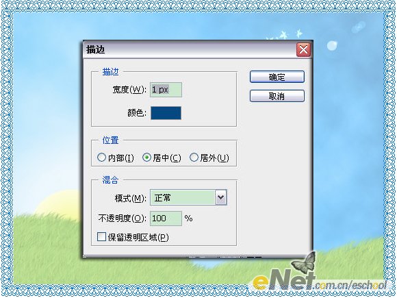 第九步:新建兩個(gè)圖層,全選描邊3象素白色(設(shè)置效果見[圖片11]),再縮小選區(qū),描一象素深藍(lán)色(顏色代碼004a81),設(shè)置效果見[圖片12]并給深藍(lán)色邊框加圖案疊加效果;得到效果見[圖片13]