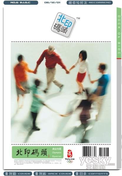在封底,繼續采用了虛化的手法表現動感力度。為了突出奧運會中來自五湖四海的友誼,采用了一群牽手的相片。同時,在封底還加上了“北印碼頭”的雜志標志和雜志條碼,進一步突出其雜志的味道。封底書籍的顏色與封面遙相呼應,突出其整體風格的一致性。如下圖所示。