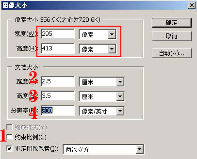 先取消約束比例,一定注意這步。然后按照 2、3、4 去做,照片的像素值就自動變成413*295px了。