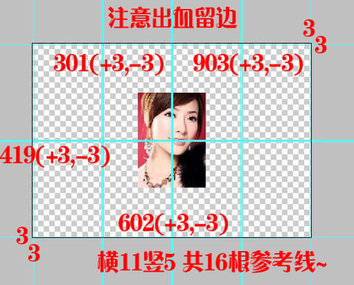 放到圖層到能看到標尺的顯示級別至 1mm,不是px !,(大約700%或更高,小心眼睛很花的),拉制參考線,共16根尺寸如圖。