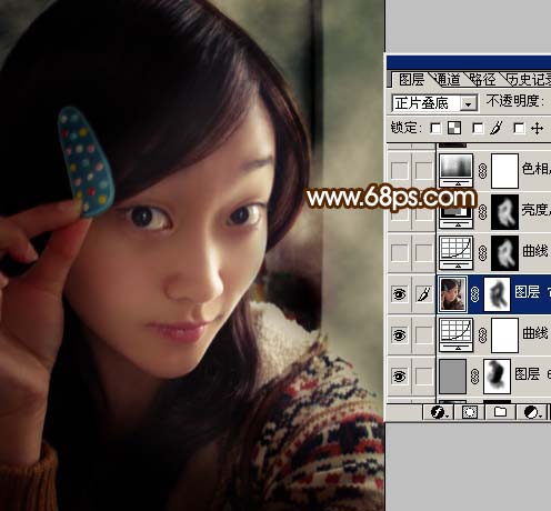 6、新建一個圖層,蓋印圖層,把圖層混合模式改為“正片疊底”,加上圖層蒙版用黑色畫筆把人物臉部稍微擦出來,效果如圖9。
