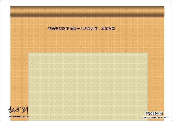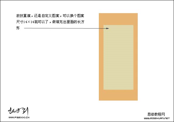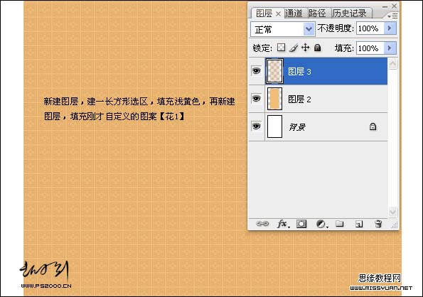 3、新建一個豎的長方形文件,新建一個圖層,用矩形選框工具拉一個比畫布稍小的矩形,填充淺黃色,再新建一個圖層,填充剛才定義的圖案。 |
