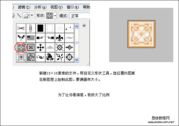 1、新建一個18 * 18像素的文件,用自定義形狀工具,載入花紋形狀,然后拉出下圖所示的圖案。如果你沒有花紋圖案可以直接用作者的效果圖。 |