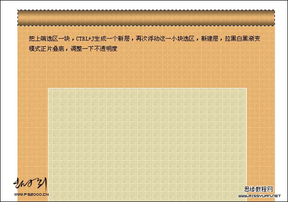5、回到黃色的圖案填充層,用矩形選框工具選取上面一段選區,復制到新的圖層,保持選區不變,新建一個圖層用漸變工具拉出黑白漸變效果,然后把圖層混合模式改為“正片疊底”,適當調整下不透明度。 |