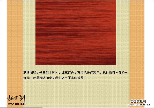 9、在最上面新建一個圖層,做一個選區,填充紅色,然后把背景設置為深灰色,前景設置為紅色,執行:濾鏡 > 渲染 > 纖維,確定后執行:編輯 > 變換 > 順時針旋轉90度。 |