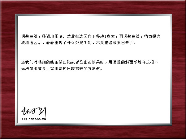 5、用選區將中心的木紋刪除,以便放照片。對金屬邊和木框設置圖層樣式,適當加點浮雕效果。 |