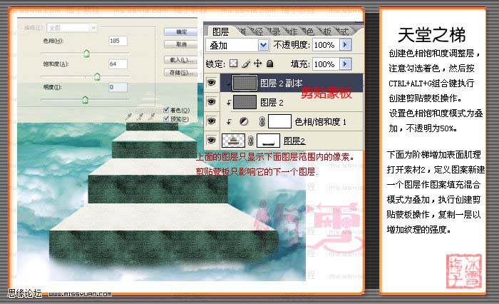 4、創建色相飽和度調整圖層,注意勾選著色,然后按ctrl + alt + g組合鍵執行創建剪貼蒙版操作。設置色相飽和度模式為疊加,不透明度為:50%。下面為階梯增加表面肌理,打開下圖素材,定義圖案。新建一個圖層做圖案填充混合模式改為“疊加”,執行創建剪貼蒙版操作,復制一層以增加紋理的強度。 |
