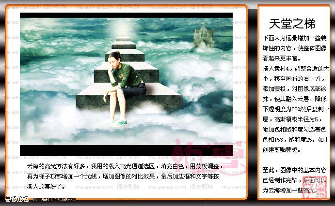 6、下面為遠景增加一些裝飾性的內容,使整體圖像看起來更豐富。加入城堡素材,調整合適的大小,移至畫布的右上方,添加蒙版對圖像底部涂抹,使其融入云層,降低不透明度為:65%,然后復制一層,高斯模糊數值為5,添加色相飽和度勾選著色,色相153,飽和度25加上創建剪貼蒙版至此,圖層中的基本操作完成。