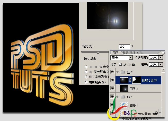 8、新建圖層,放于文字組之上(如果在文字組里,應將它拖出來),填充黑色,執行濾鏡—渲染—鏡頭光暈,選105毫米聚焦,亮度:100%,改變圖層混合模式為:柔光,將它放在你想突出高光的位置,這里我把它放到右下的s字母處;復制一層,變換位置,放到左上的p和s之間處;添加蒙版,用黑色畫筆將其它地方被遮暗的地方擦掉;將這兩層光歸到一個組里。 |
