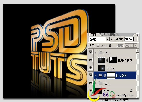 9、現在來做文字的倒影。將文字組復制一份,ctrl+t點右鍵—垂直翻轉,拖下來,再點右鍵—透視,點住左邊中間的節點往上推,給組添加蒙版,按d鍵恢復默認顏色,選擇漸變工具,選第一個黑/白漸變,在蒙版上拉出漸變。效果如圖: |