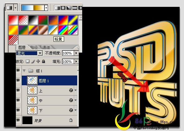 7、新建圖層,放于“上”層之上,按住ctfl鍵載入“上”層的選區,選擇漸變工具,選擇“鉻黃漸變”,從左上至右下拉出漸變,取消選區,并將漸變圖層模式改為:柔光。 |