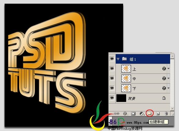 5、將文字復制兩層,分別命名為“上”、“中”、“下”層,用鍵盤上的箭頭移動文字,位置如圖;新建一個組,將這三層文字拖到組里。 |