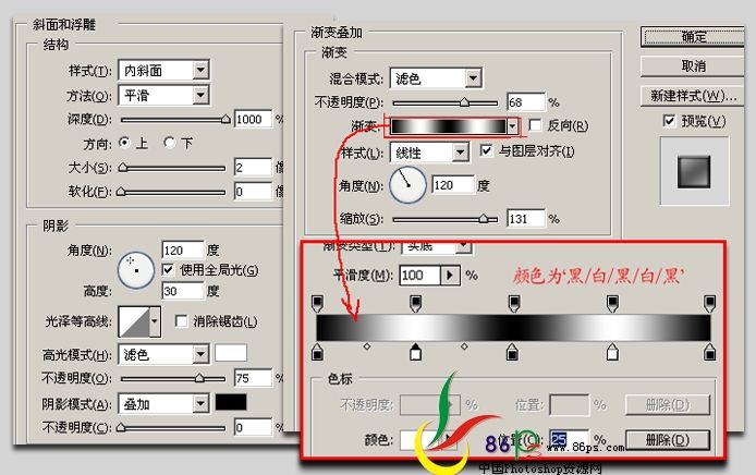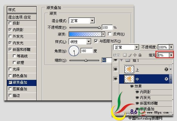 6、選擇中間文字層,將圖層填充度改為:0%,并改變漸變疊加,設置如圖: |