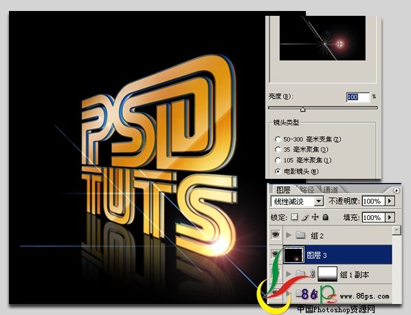 10、新建圖層,放于白光組與文字倒影組之間,填充黑色,執行濾鏡—渲染—鏡頭光暈,選電影鏡頭,亮度:100%,點住光暈上的十字拖動位置,最后把圖層模式改為:線性減淡。 |