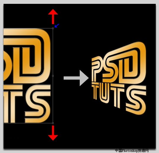 4、現在將文字變換一下角度。ctrl+t點右鍵—透視,點住左邊的上下兩節點往里推,點住右邊的兩節點往上下拖 |