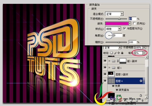 13、回到我們的文字上,新建一個圖層于背景層之上,編輯—填充,圖案,選擇剛才定義的圖案,確定;將圖層不透明度降為0%,給它添加一個圖樣式:漸變疊加,顏色:#dd04ad,不透明度改為:64%。 |