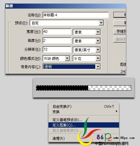 12、新建一個40*2的透明文檔,用放大工具放大它,用矩形選框工具選一半,填充黑色,取消選區;選擇編輯—定義圖案,確定,關掉文檔。 |