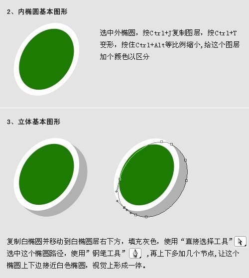 2、內橢圓的制作方法。 選中外橢圓,按ctrl + j復制一層,按ctrl + t變形,按照ctrl + alt等比例縮小,給這個圖層填充綠色。 3、復制白橢圓,再復制一層,移到白色橢圓的下層,然后再向右下方移動一下,然后選擇“直接選區工具”,選中這個橢圓路徑,再用鋼筆工具多加幾個節點,讓這個橢圓上下邊接近白色橢圓,視覺上刑場統一。 |
