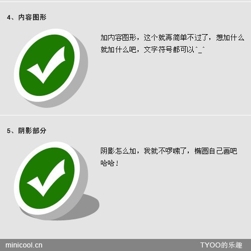 4、加內容圖形,選擇自定義形狀工具,選擇√圖形,其它圖形也可以。 5、陰影部分,在最下面新建一個圖層用畫一個深灰色橢圓即可。 |