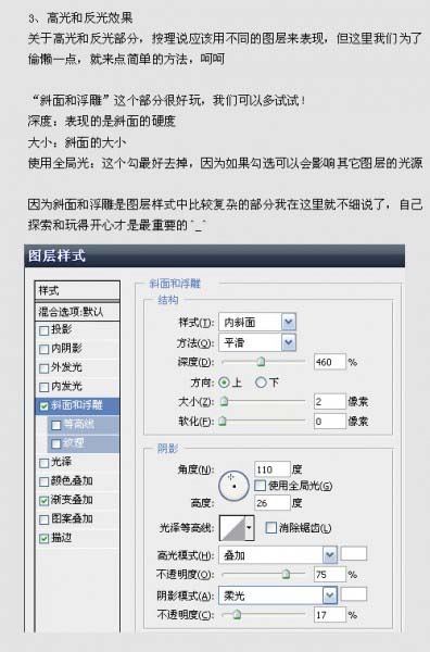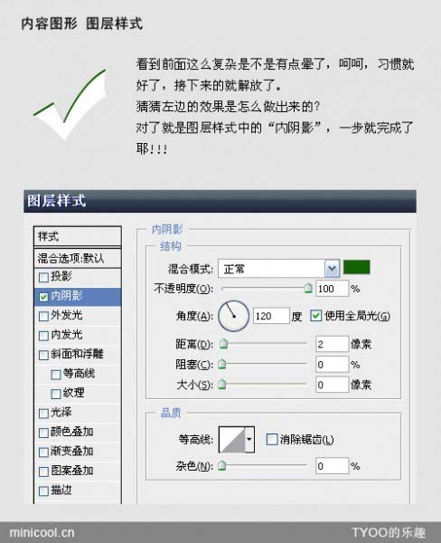 7、回到√圖形圖層,雙擊圖層調出圖層樣式,參數設置如下圖。 |