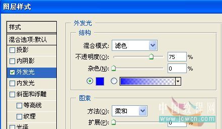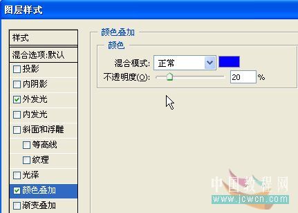 第8步:在圖層面板選中第二層,然后雙擊調出圖層樣式對話框 ,并設置以下設置(外發光和顏色疊加) 如下圖: