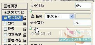 第4步:按ctrl + shift + n創建一個新的層(圖層 2)。選擇畫筆工具,設置前景顏色為# ffffff (白) ,畫筆大小4像素、硬度為100 % 。按f5調出畫筆面板,在形狀動態欄-控制-選擇鋼筆壓力,如圖
