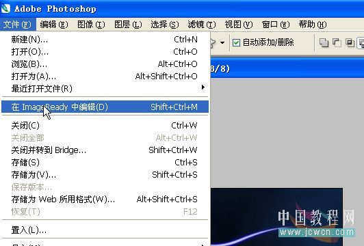 現在,我們將轉到imageready編輯,在photoshop 文件的下拉菜單中點擊“在imageready中編輯”