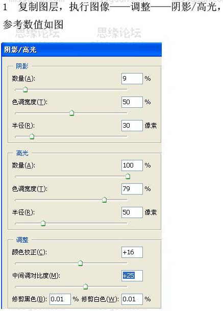2、把副本圖層加上圖層蒙版,蒙版填充黑色,然后選擇白色畫筆工具把人物部分擦出來。 3、新建一個圖層,按ctrl + alt + shift + e蓋印圖層,再執行:圖像 > 調整 > 陰影/高光,參數設置自定,確定后加上黑色蒙版用白色畫筆把皮膚部分擦出來。 |