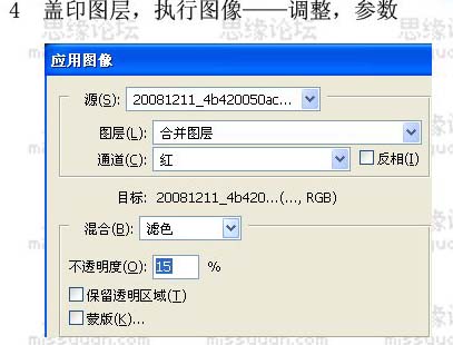 4、新建一個圖層,蓋印圖層,再執行:圖像 > 應用圖像,參數設置如下圖。 |