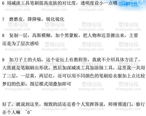 6、用減淡工具,透明度設置小一點,提高皮膚的對比度。 7、給人物適當磨皮及降噪處理,再適當銳化一下。 8、把當前操作層復制一層,執行:濾鏡 > 模糊 > 高斯模糊,數值為3左右,確定后加上圖層蒙版,用黑色畫筆把人物及近景擦出來。 9、最后給刀子加上血跡,大致方法,先用紅色筆刷刷出形狀,然后用加深/減淡工具加涂抹工具,這里一共用了三層,一層黃色,二層紅,還可以用不同的顏色筆刷給衣服加上比較夢幻的色彩,圖層模式用疊加即可。 |