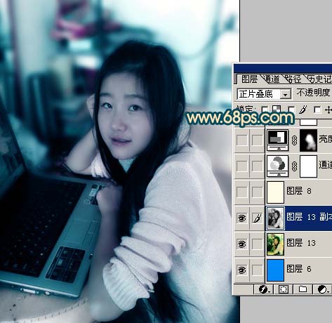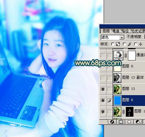 8、新建一個圖層,蓋印圖層,然后把圖層混合模式改為“柔光”,然后在剛才蓋印圖層下面新建一個圖層,填充顏色:#0089f9,圖層混合模式改為“濾色”,效果如圖11。 |