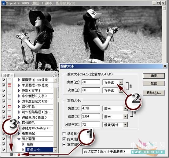 6:使用“圖像”-“圖像大小”命令,對圖片進行縮小操作。將單位設置為百分比(標示2處所示),保持“約束比例“選項的情況下,將寬度設置為20,因為有了約束比例,所以高度也自動被設置為20。單擊確定,這樣我們就將圖片的長和寬都縮小到原來的五分之一大小。單擊“停止播放/記錄”按鈕(標示3處所示),結束動作的記錄。