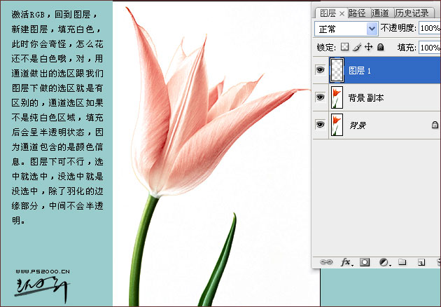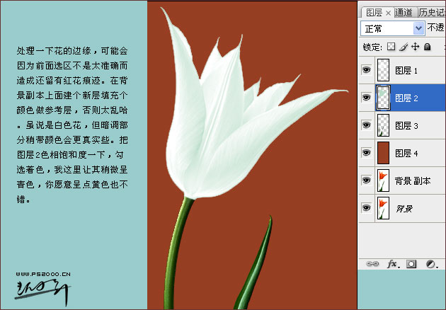 8、處理一下花的邊緣,然后在背景副本下面新建一個圖層填充顏色做參考。 |