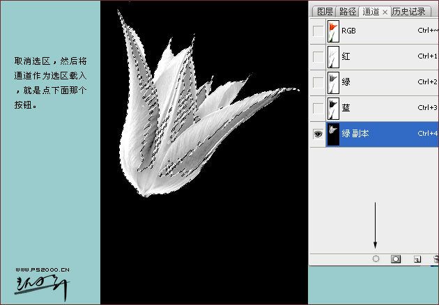 4、取消選區,然后將通道作為選區咋如,就是點下面那個按鈕。 |