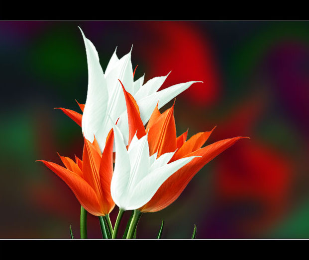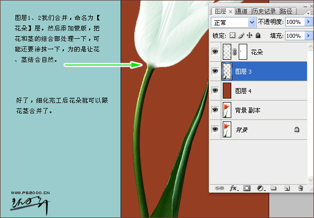 9、把圖層1、2合并,命名為花朵層,然后添加蒙版把花和莖的結合部處理一下,可能還要涂抹一下,為的是讓花、莖結合自然。好了細化完工就可以跟花莖合并了。 |